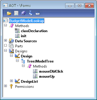 ============== 1. In the AOT, create a new form named BudgetModelLookup. Set its design properties as follows: Property Value Frame Border WindowType Popup 2. Add a new Tree control to the design, with the following properties: Property Value Name ModelTree 3. Add the following line to the form's class declaration: BudgetModelTree budgetModelTree; 4. Override the form's init() method with the following code: public void init() { FormStringControl callingControl; callingControl = SysTableLookup::getCallerStringControl (this.args()); super(); budgetModelTree = BudgetModelTree::construct(ModelTree, callingControl.text()); budgetModelTree.buildTree(); } 5. Override the mouseDblClick() and mouseUp() methods of the ModelTree control with the following code, respectively: public int mouseDblClick(int _x, int _y, int _button, boolean _ctrl, boolean _shift) { int ret; FormTreeItem formTreeItem; BudgetModel budgetModel; ret = super(_x, _y, _button, _ctrl, _shift); formTreeItem = this.getItem(this.getSelection()); select firstOnly SubModelId from budgetModel where budgetModel.RecId == formTreeItem.data(); element.closeSelect(budgetModel.SubModelId); return ret; } public int mouseUp(int _x, int _y, int _button, boolean _ctrl, boolean _shift) { int ret; ret = super(_x, _y, _button, _ctrl, _shift); return 1; 6. The form should look similar to the following screenshot: 7. In the AOT, open the BudgetModel table, and change its lookupBudgetModel() method with the following code: public static void lookupBudgetModel(FormStringControl _ctrl, boolean _showStopped = false) { Args args; Object formRun; args = new Args(); args.name(formStr(BudgetModelLookup)); args.caller(_ctrl); formRun = classfactory.formRunClass(args); formRun.init(); _ctrl.performFormLookup(formRun); } 8. To see the results, open Budgeting | Common | Budget register entries. Start creating a new entry by clicking on the Budget register entry button in the action pane, and expand the Budget model lookup: Источник: http://axmas.blogspot.com/2012/11/bu...ee-lookup.html